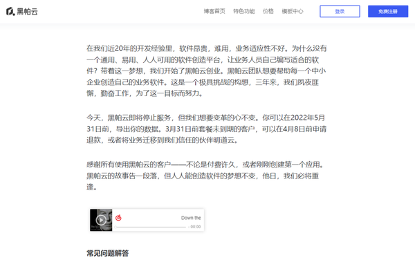3月21日,黑帕云发布公告,将于5月31日停止服务!曾经上过艾瑞咨询、风光无限的黑帕云,停止服务了!