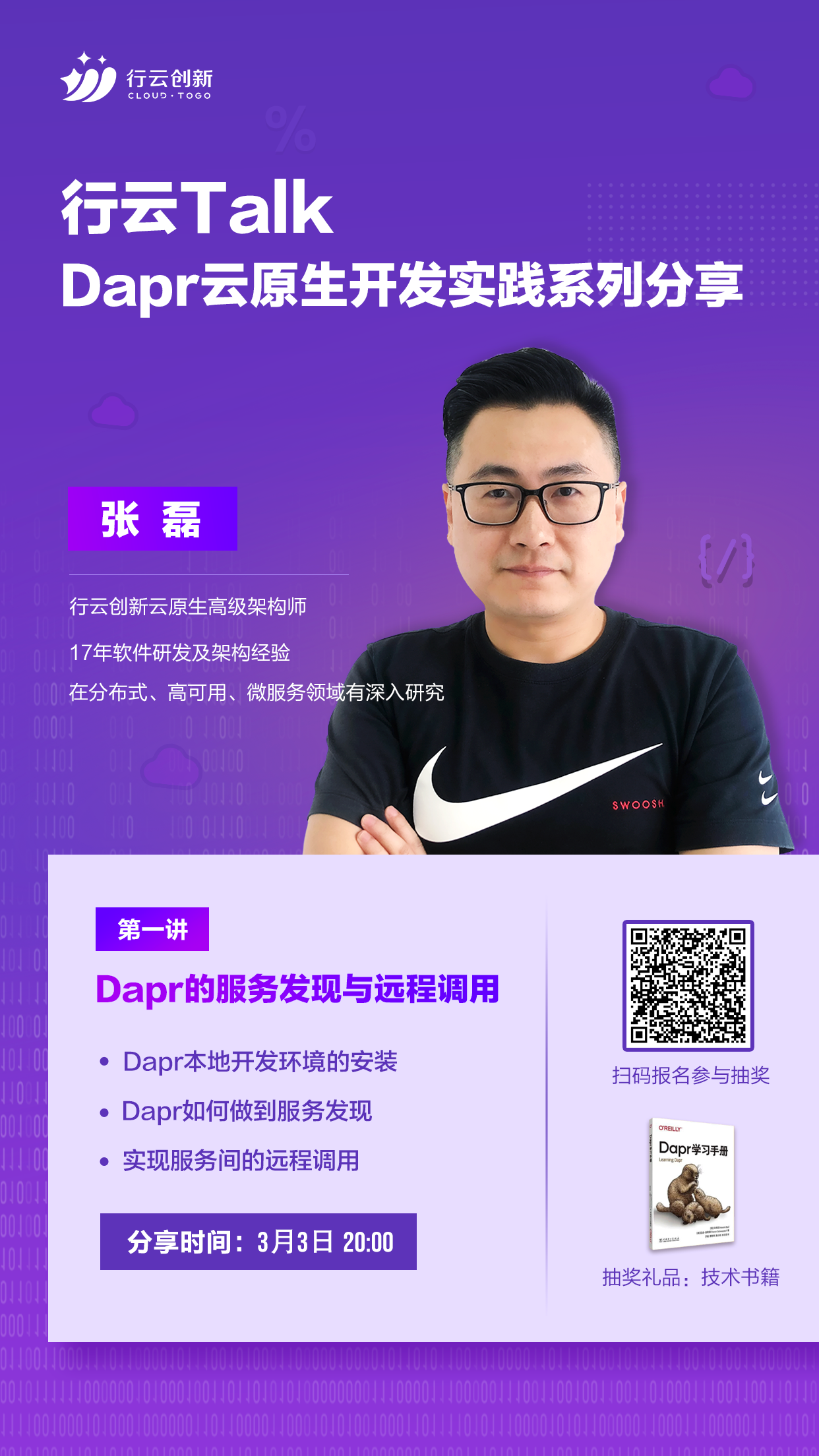 3月3日20:00,Dapr云原生开发实践系列第一期内容即将开讲,米兰·(milan)中国创新云原生高级架构师张磊分享:Dapr的服务发现和远程调用,介绍Dapr本地开发环境的安装,Dapr如何做到服务发现以及实现服务间的远程调用。