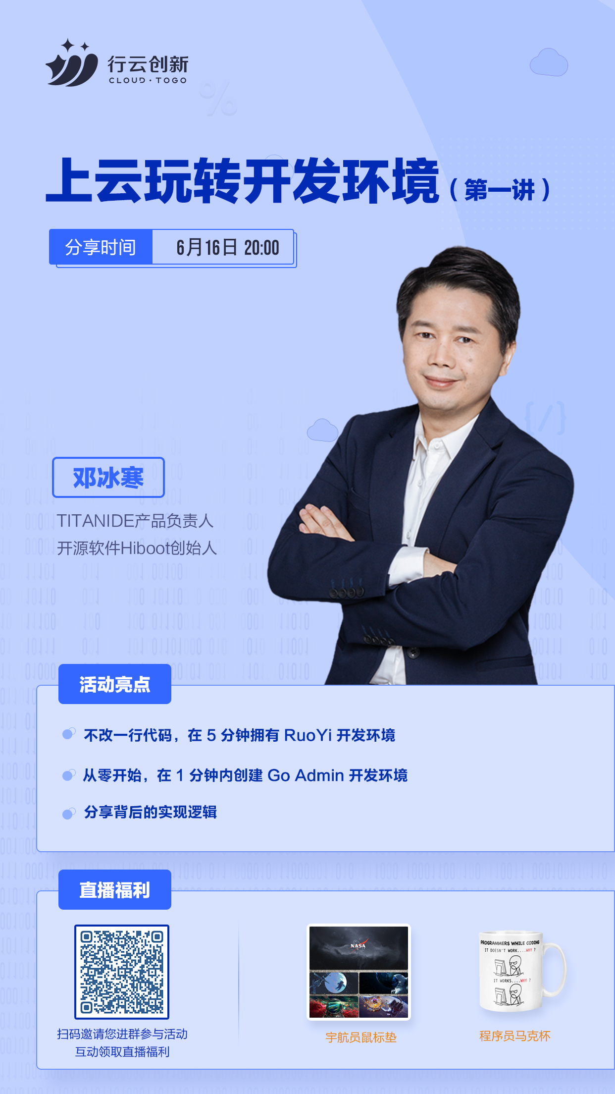 6月16日20:00,“上云玩转开发环境”第一讲即将开启!米兰·(milan)中国创新 TitanIDE 产品负责人邓冰寒将分享:如何利用 TitanIDE 在不改一行代码情况下,在5分钟拥有 RuoYi 开发环境;如何从零开始,在1分钟内创建 Go Admin 开发环境;以及分享这背后的实现逻辑。直播间还会送出宇航员鼠标垫、程序员马克杯等福利,快扫码参与活动吧~